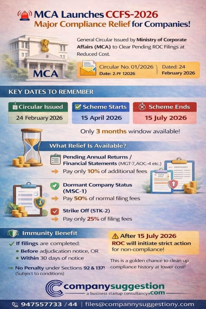 CCFS-2026 is introduced to address this issue. The scheme reduces the burden of companies to pay accumulated additional fees, by allowing them to pay only 10% of the additional fee otherwise payable.